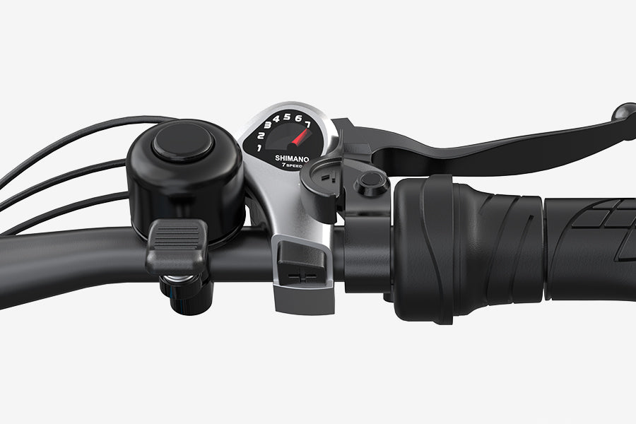 The Shimano 7-speed gear shifter, combined with a multi-function thumb lever, allows riders to seamlessly adapt to varying speeds and terrains. This intuitive control enables effortless gear changes and quick switching between the three pedal assist levels for optimal performance in all conditions.