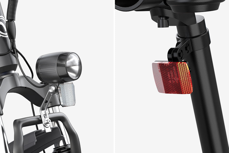 Featuring a bright front headlight and a rear light, ensuring your safety during night rides and in low-light conditions. The headlight clearly illuminates your path while both lights work together to make you highly visible to other road users, providing double protection for a secure ride.